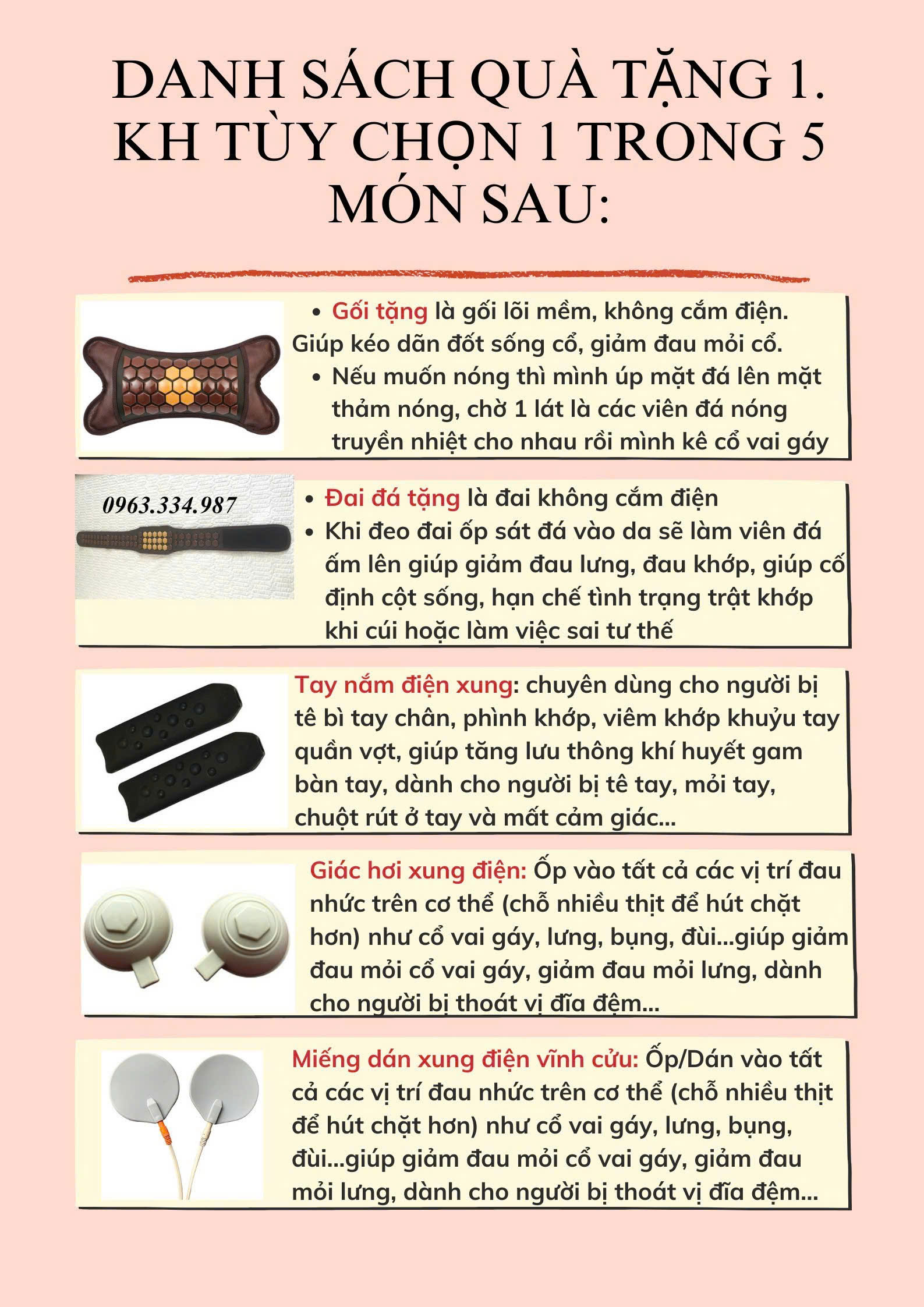 Quà tặng 1: Khách hàng tuỳ chọn 1 trong các món sau: 1 Gối đá không nhiệt hoặc 1 Đai đá ấm giữ cột sống hoặc 1 cặp xung điện