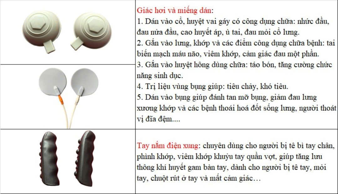 + 1 Cặp pad chuông (Giác hơi xung điện): Ốp/Dán vào tất cả các vị trí đau nhức trên cơ thể (chỗ nhiều thịt để hút chặt hơn) như cổ vai gáy, lưng, bụng, đùi…giúp giảm đau mỏi cổ vai gáy, giảm đau mỏi lưng, dành cho người bị thoát vị đĩa đệm…